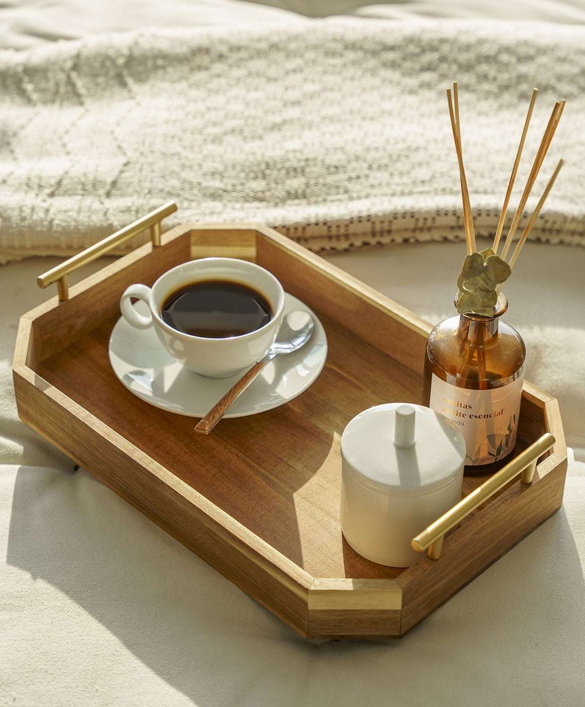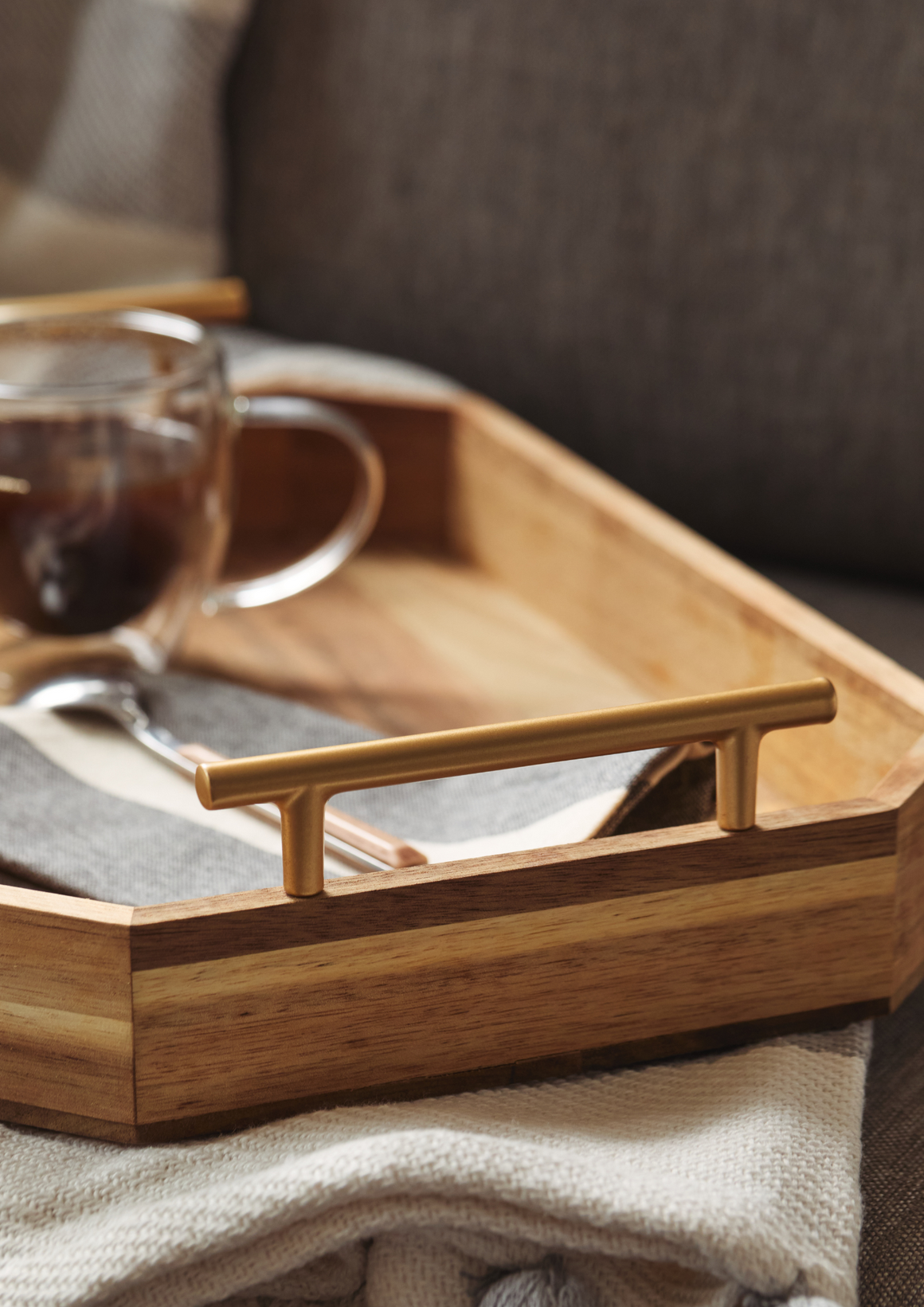Nuestra bandeja de madera acacia con manijas de metal doradas es el toque perfecto para darle un giro especial a tus momentos cotidianos. Ideal para momentos especiales o para sorprenderte a ti mismo.