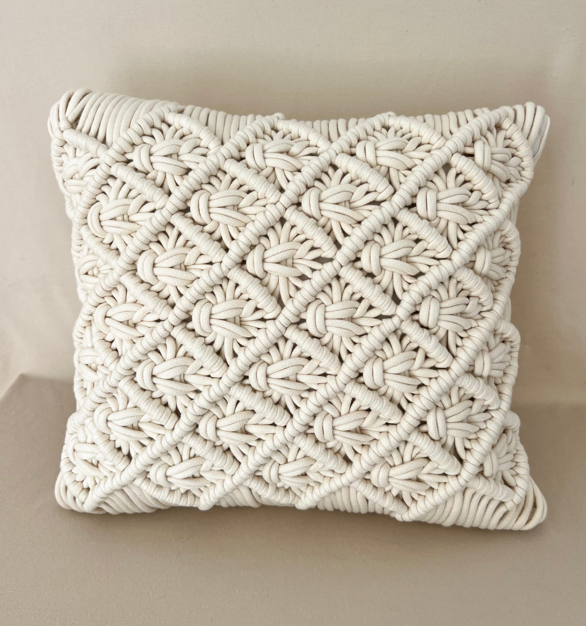 Tejido a mano con la técnica de macramé. Elaborado con cordón de algodón premium extra suave y tela dril de algodón.