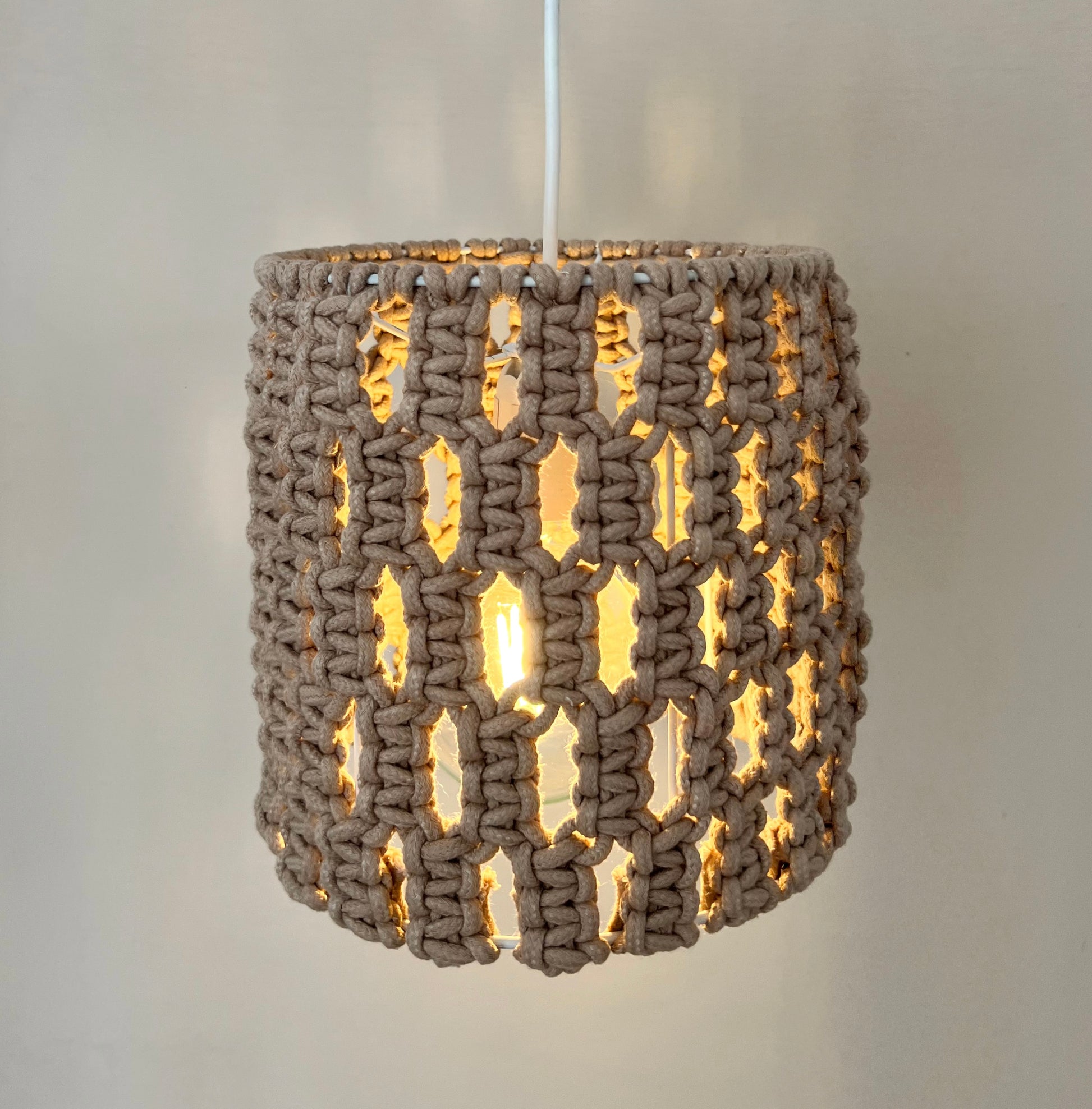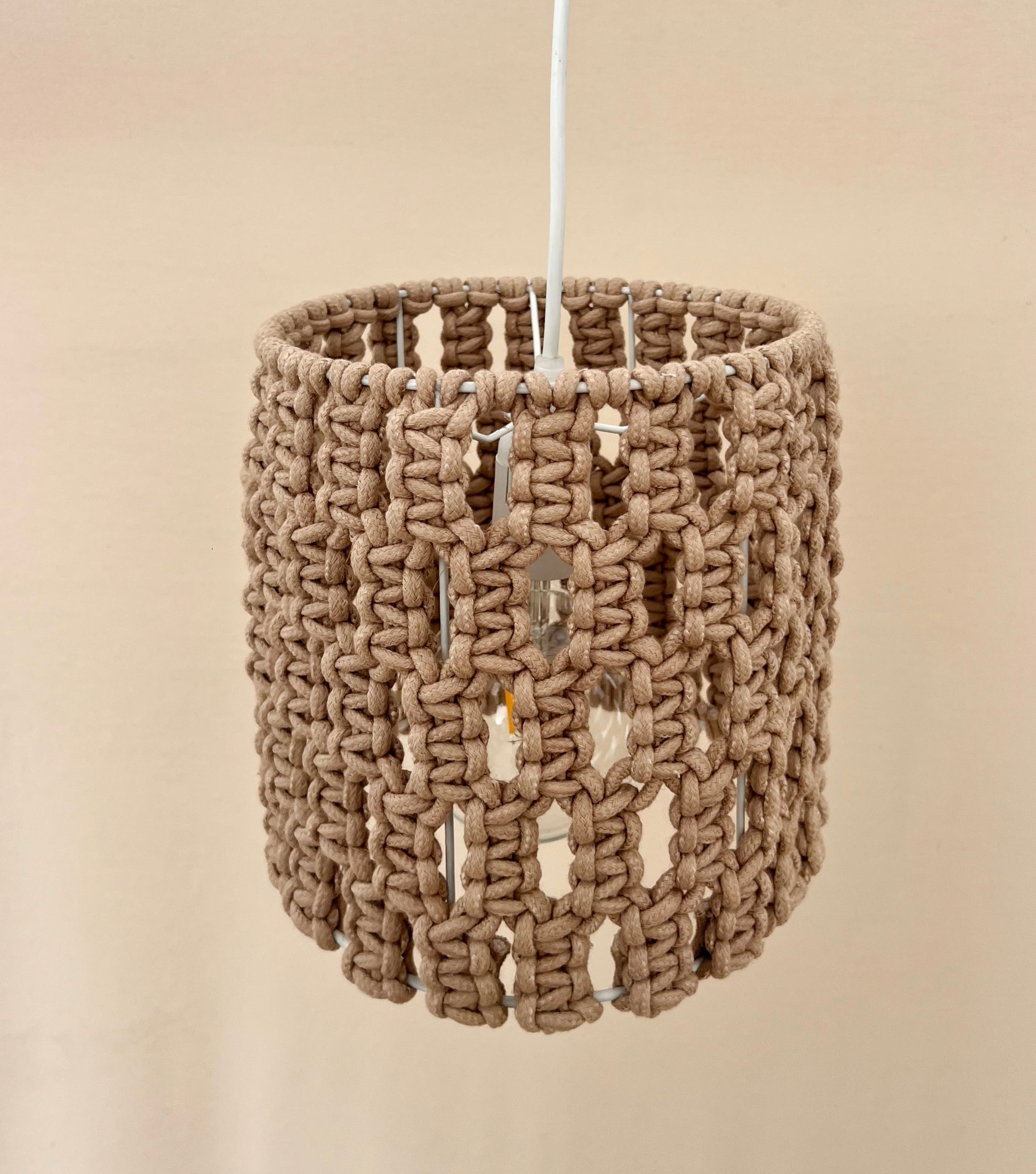 Lámpara colgante tejida a mano en macramé. Estructura de fierro. Luz cálida.