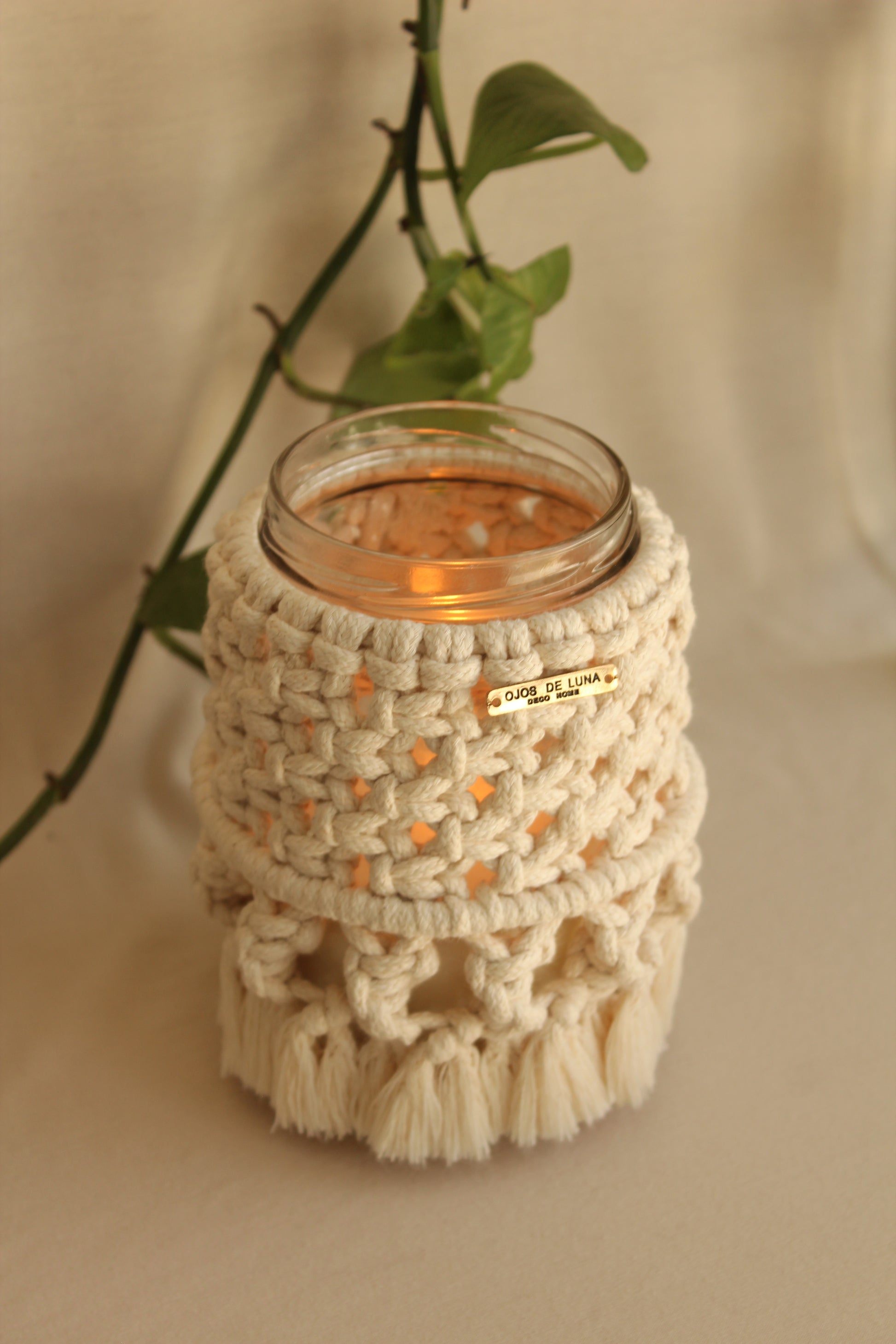 Vela artesanal elaborada con cera de soya y tejida con la técnica de macramé.