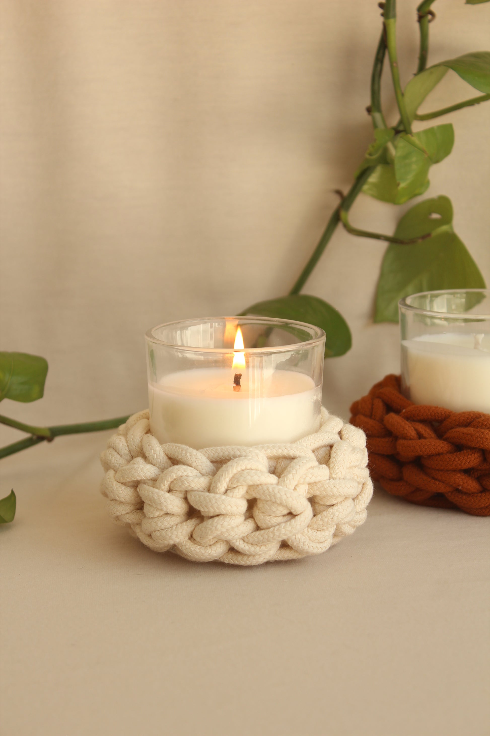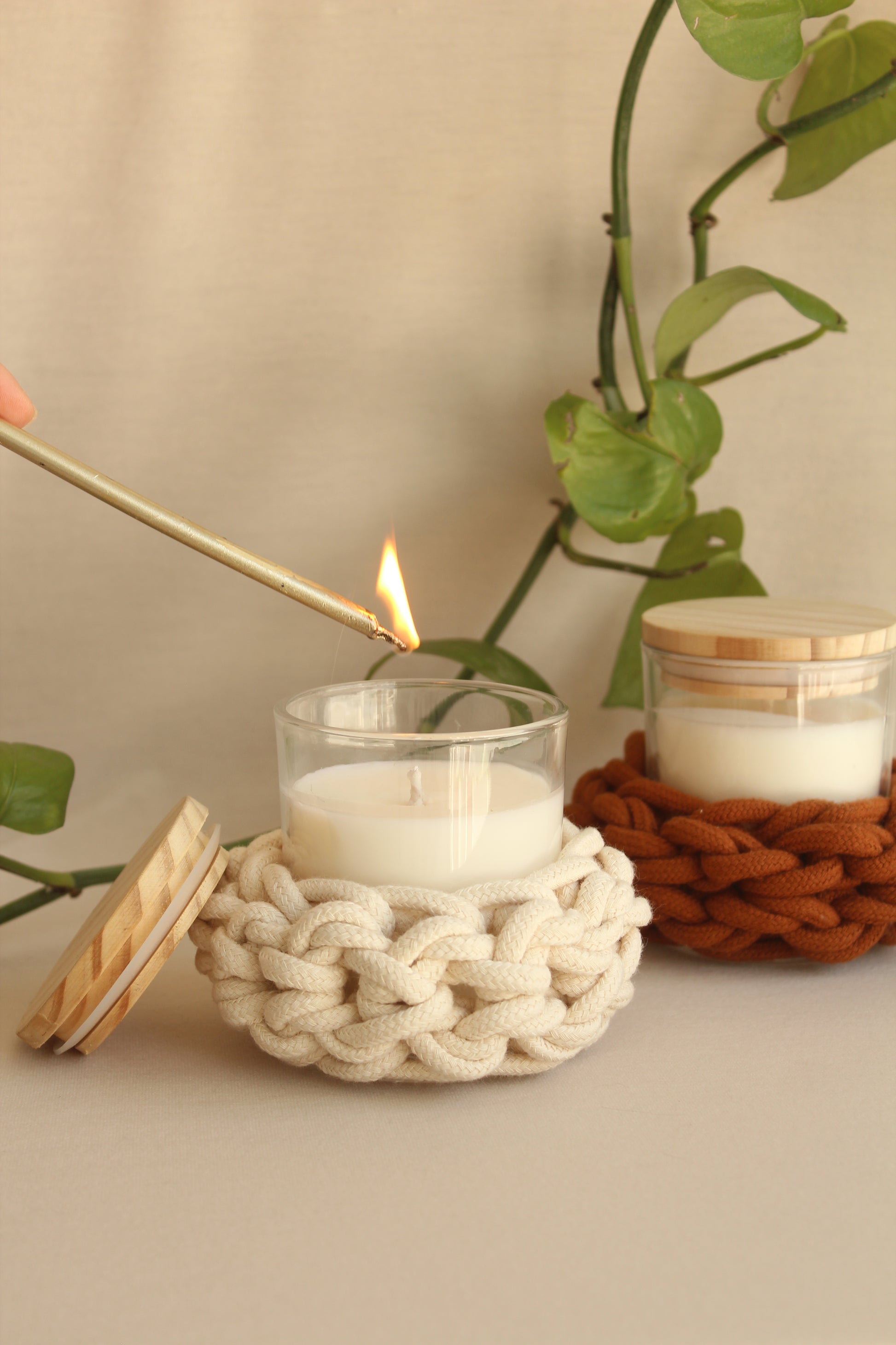 Vela elaborada artesanalmente con cera de soja y detalle de tejido en macramé.